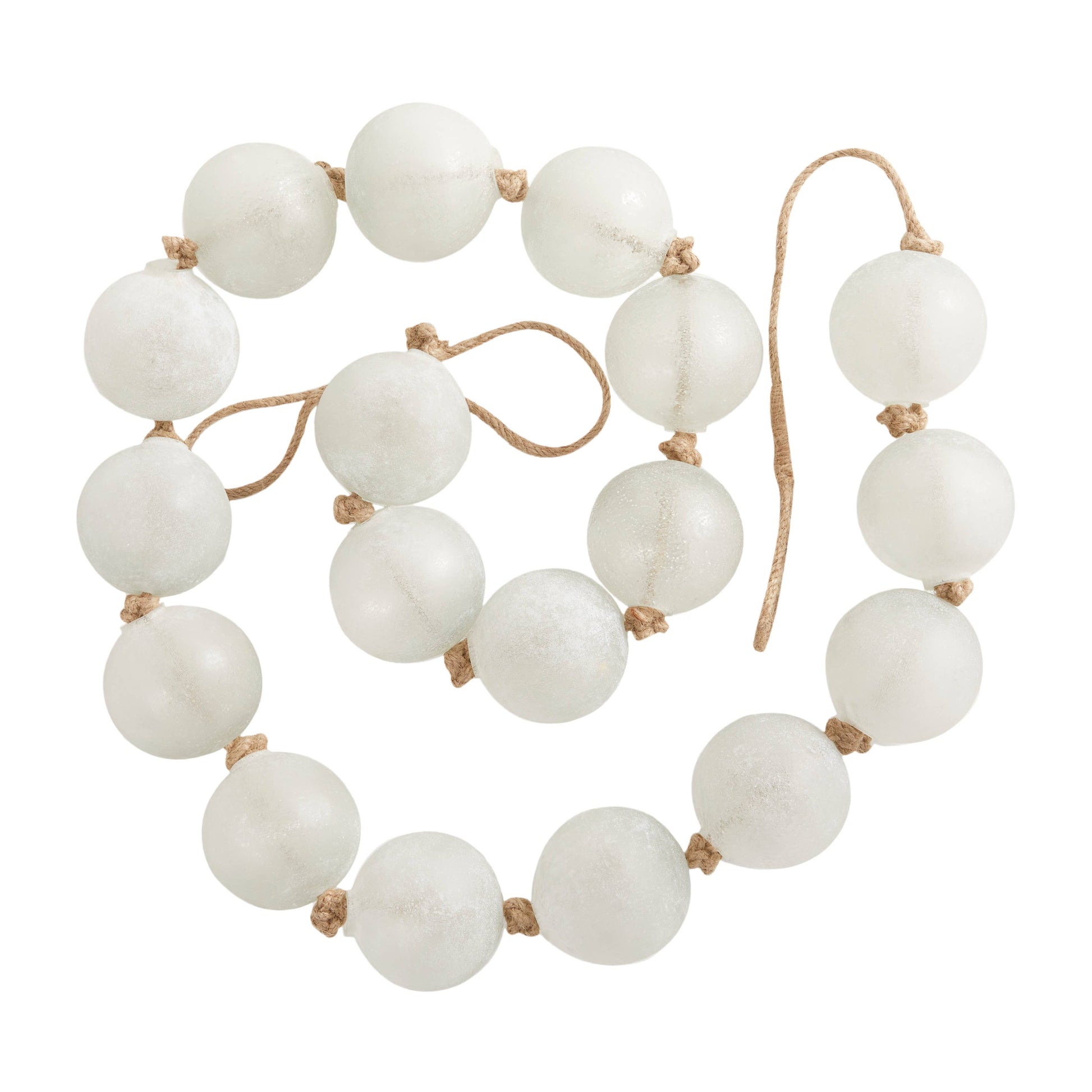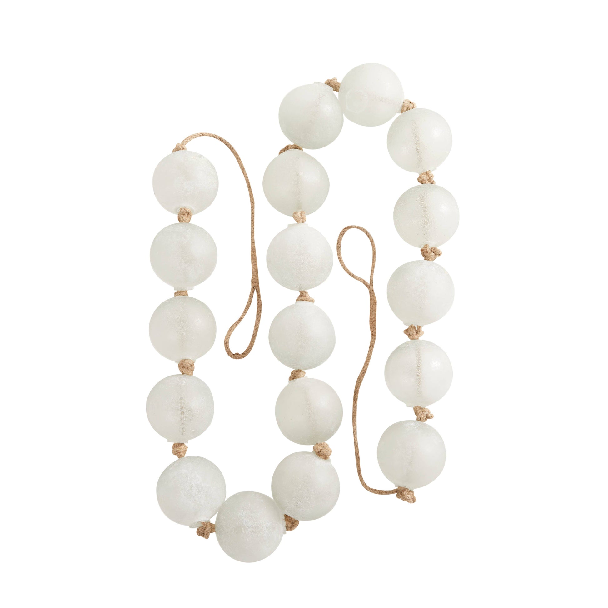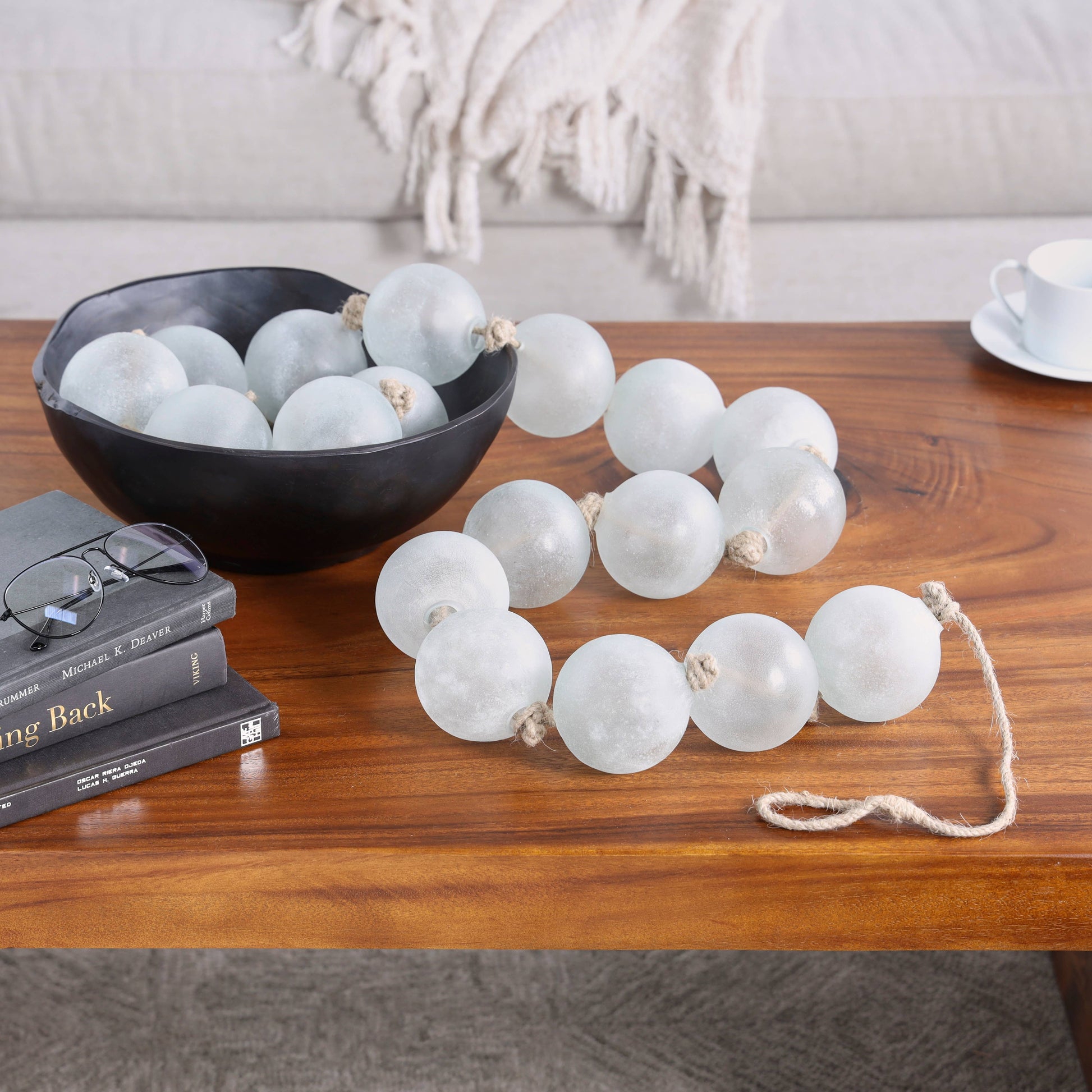 Style this glass garland draped across a mantle, console, or staircase, or feature it as a centerpiece in a large bowl to create a stunning visual impact and bring texture and dimension to the home. This is a single glass garland with large beads and a tassel. Coastal style.
