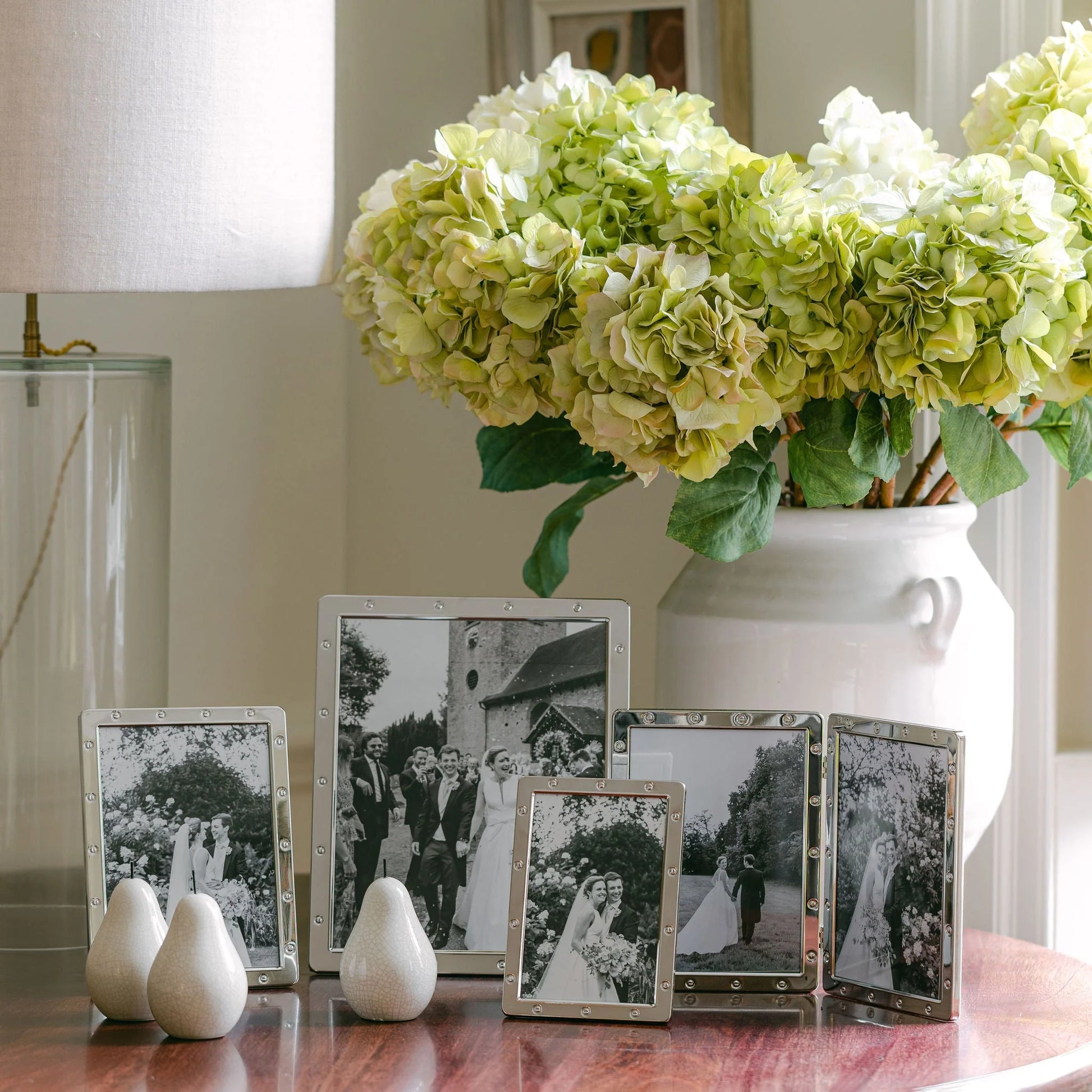 A beautiful gold or silver-plated frame with screw detail, curved corners, and a beautiful dove grey velvet back-stand. Able to stand in landscape or portrait and beautifully gift boxed.